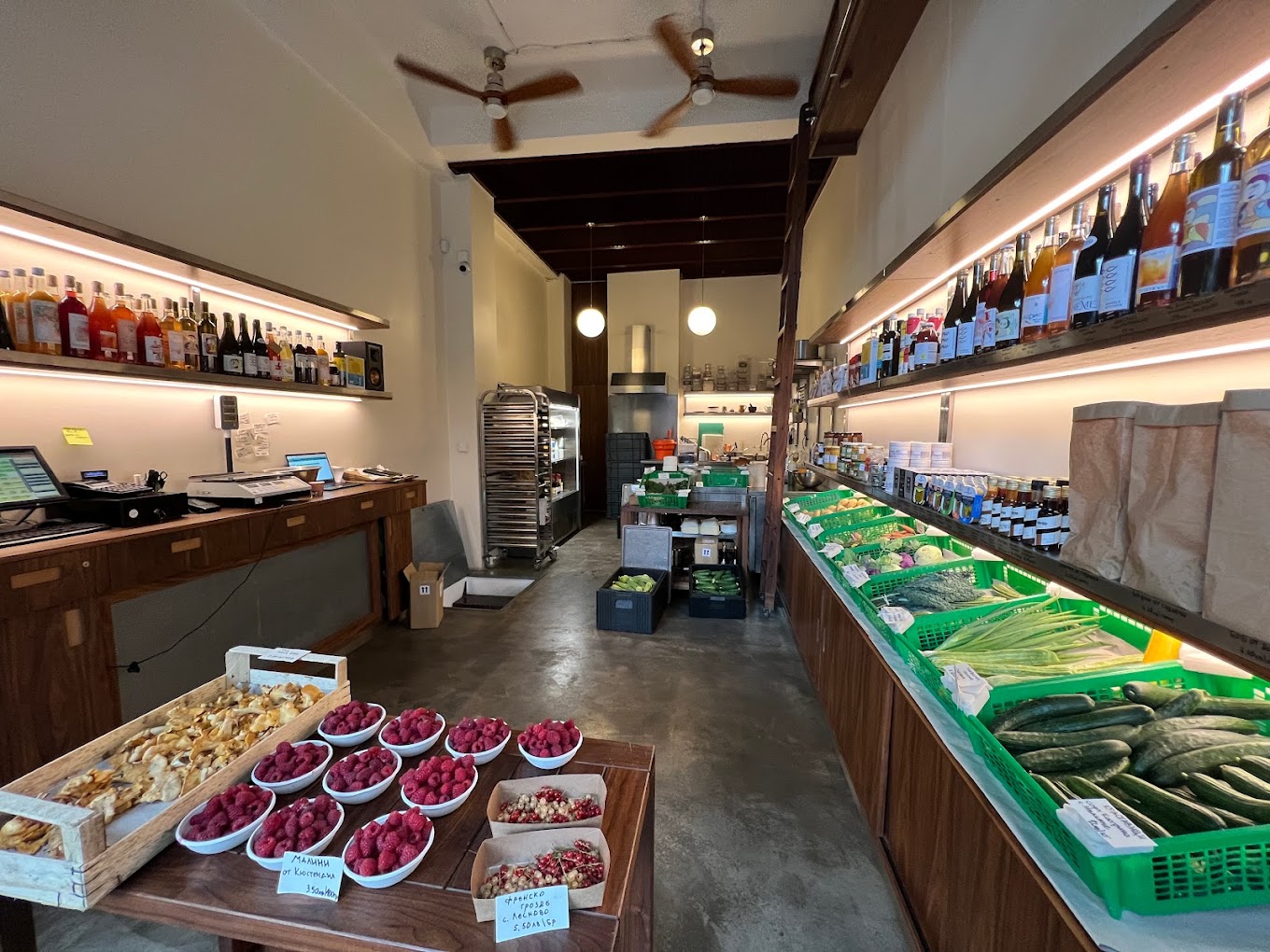 Корекомът (направи справка в нета, ако не знаеш какво е това), както му казват съседите, е магазин за плодове и зеленчуци от регенеративна градина, отново с участието на собственика на всичко изброено дотук, от малки ферми и за бакалски стоки от занаятчийски марки – сол, сирена, оцет, рибни, брашно, леща, боб и т.н. Внасят си лимони, авокадо и зехтин от остров Крит и второто е може би най-доброто в София, третият – по-скоро приличен. Рибните консерви са чудни, както и оцетите им. Някои неща са прекрасно вкусни и чисти, като домати, чушки, картофи и гъби например, други са също с добър вкус, но смятаме, че да искаш да предложиш глава карфиол на българин за цената от 17 лева е като да си просиш боя и просто чакаш да видиш на кого ще му стиска.